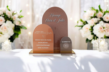 Mais, voyant la complicité des deux enfants, Olivier a eu un jour une idée. « Si on organisait le baptême commun des deux enfants ? ». Thomas et Julie furent tout de suite emballés. Ils avaient de toute façon prévu de faire baptiser leur fille. Ni une ni deux, les couples se penchèrent sur la question. Pas plus d’un mois plus tard, ils avaient déjà réservé la salle (un petit restaurant à 20km d’Autun) et prévenu le prêtre. Ne manquait plus que la décoration du lieu. Pour coller avec l’ambiance boisée du restaurant, ils avaient choisi de décorer leur salle sur le thème champêtre. Ils y accrochèrent donc des nœuds de toile de jute aux chaises et disposèrent des bouquets de fleurs séchées sur les tables. Ils n’attendaient pas moins de 40 invités. Julie eu alors une idée. Elle récupéra les marques places en bois gravés par Grave-moi une histoire pour leur mariage et les disposa selon le plan de table. Les rondins collaient ainsi parfaitement avec la décoration !